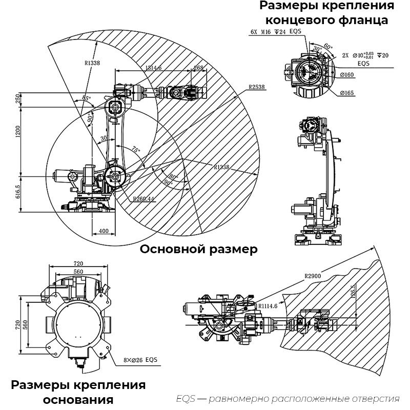 Максимальный размах манипулятора составляет 3168 мм. Такой огромный радиус действия позволяет одной роботизированной ячейке обслуживать сразу несколько производственных станций, станков с ЧПУ или термопластавтоматов. Это значительно упрощает интеграцию робота в существующие линии и позволяет рационально использовать площадь цеха с минимальными перемещениями основания.