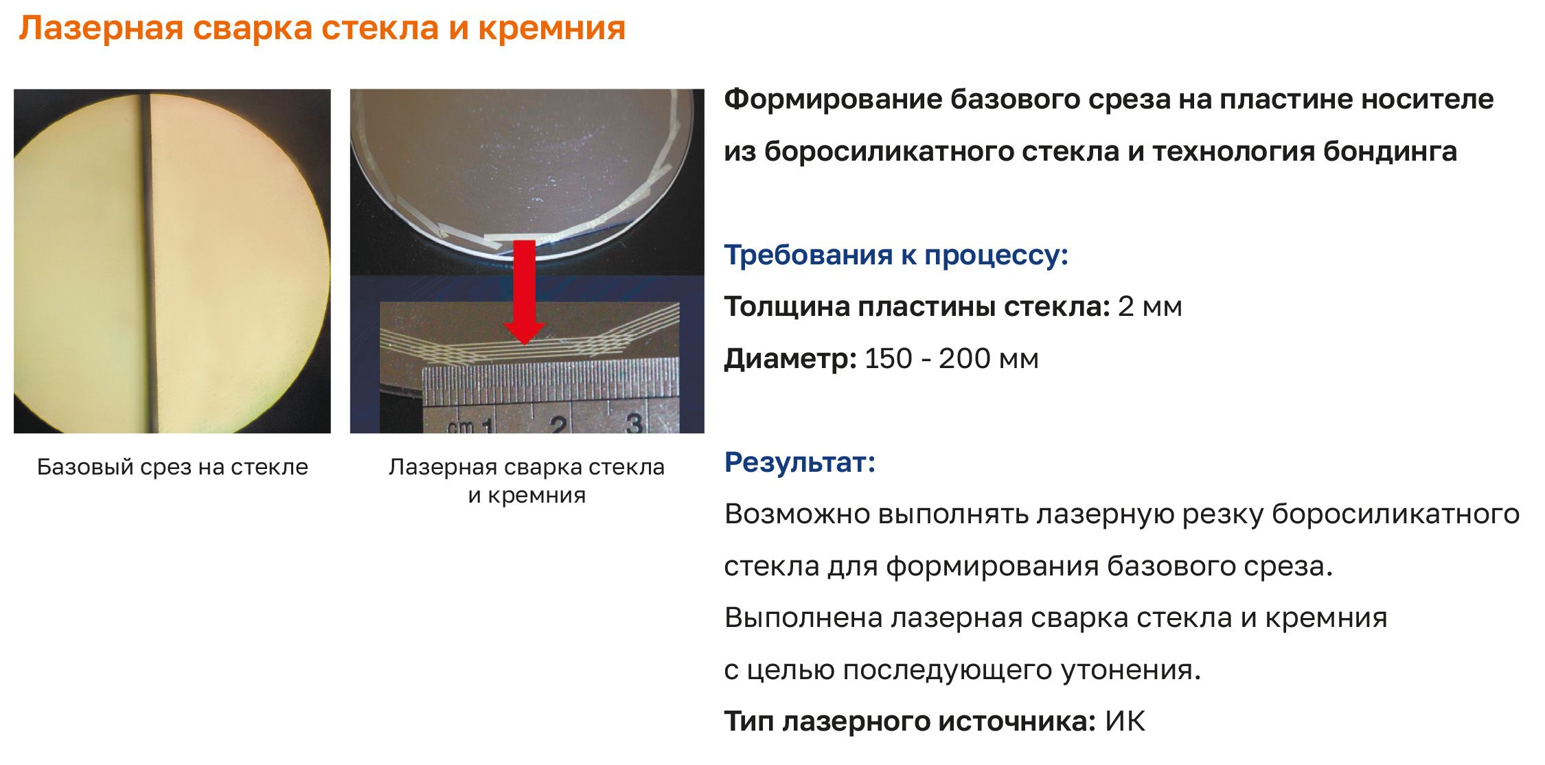 - Лазерная сварка стекла — соединение стекла со стеклом, стекла с металлами и кремнием без трещин и внутренних напряжений.