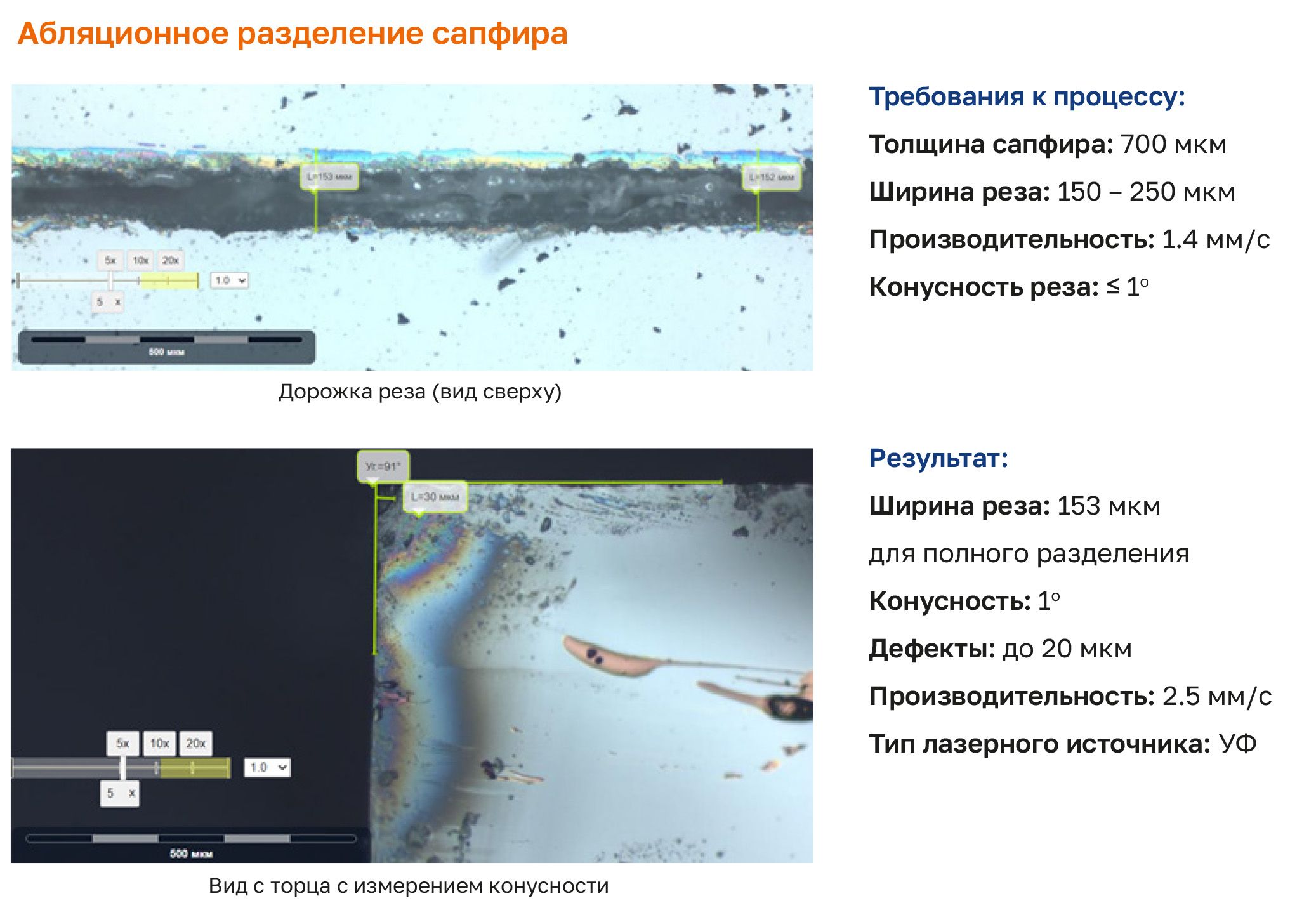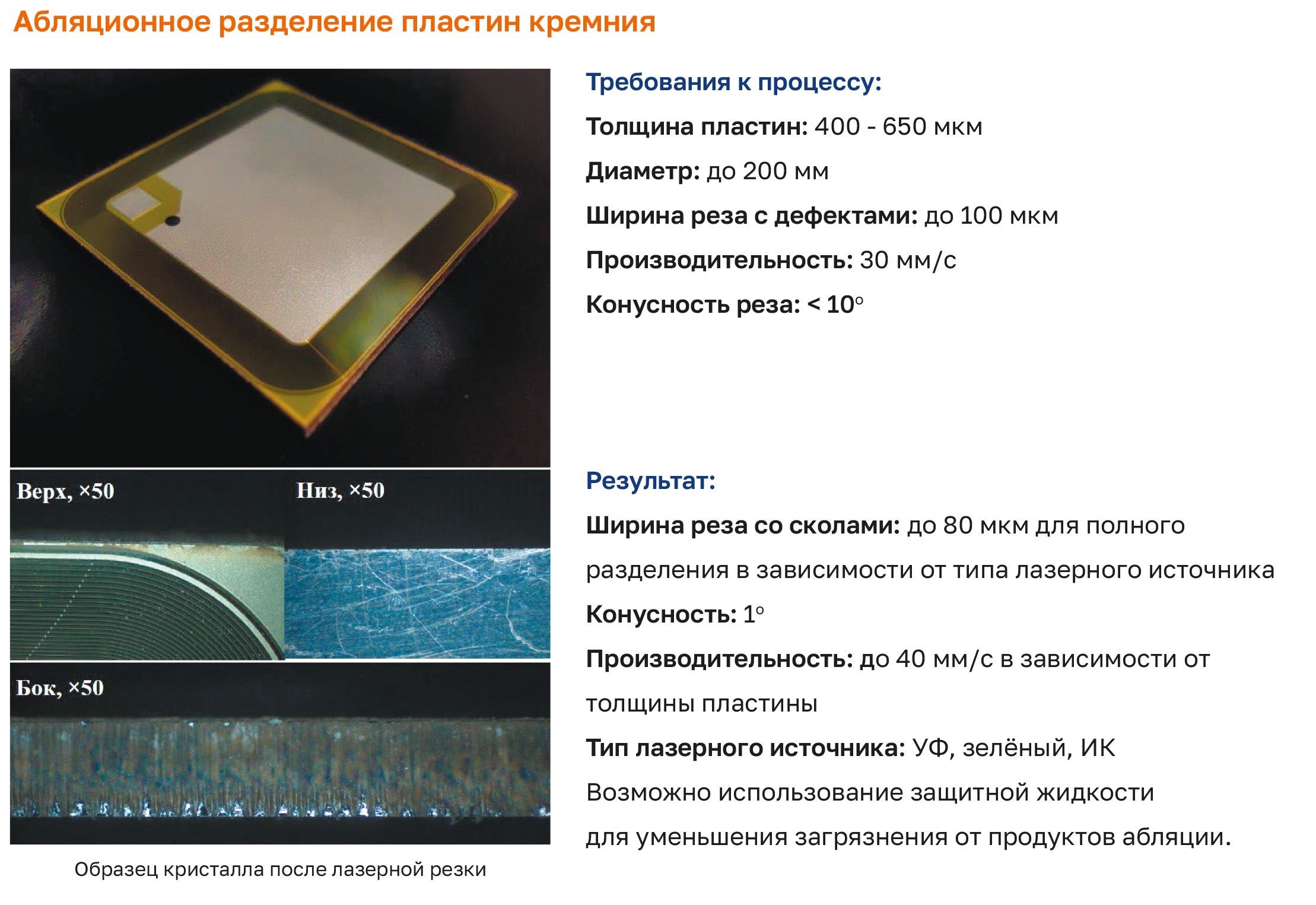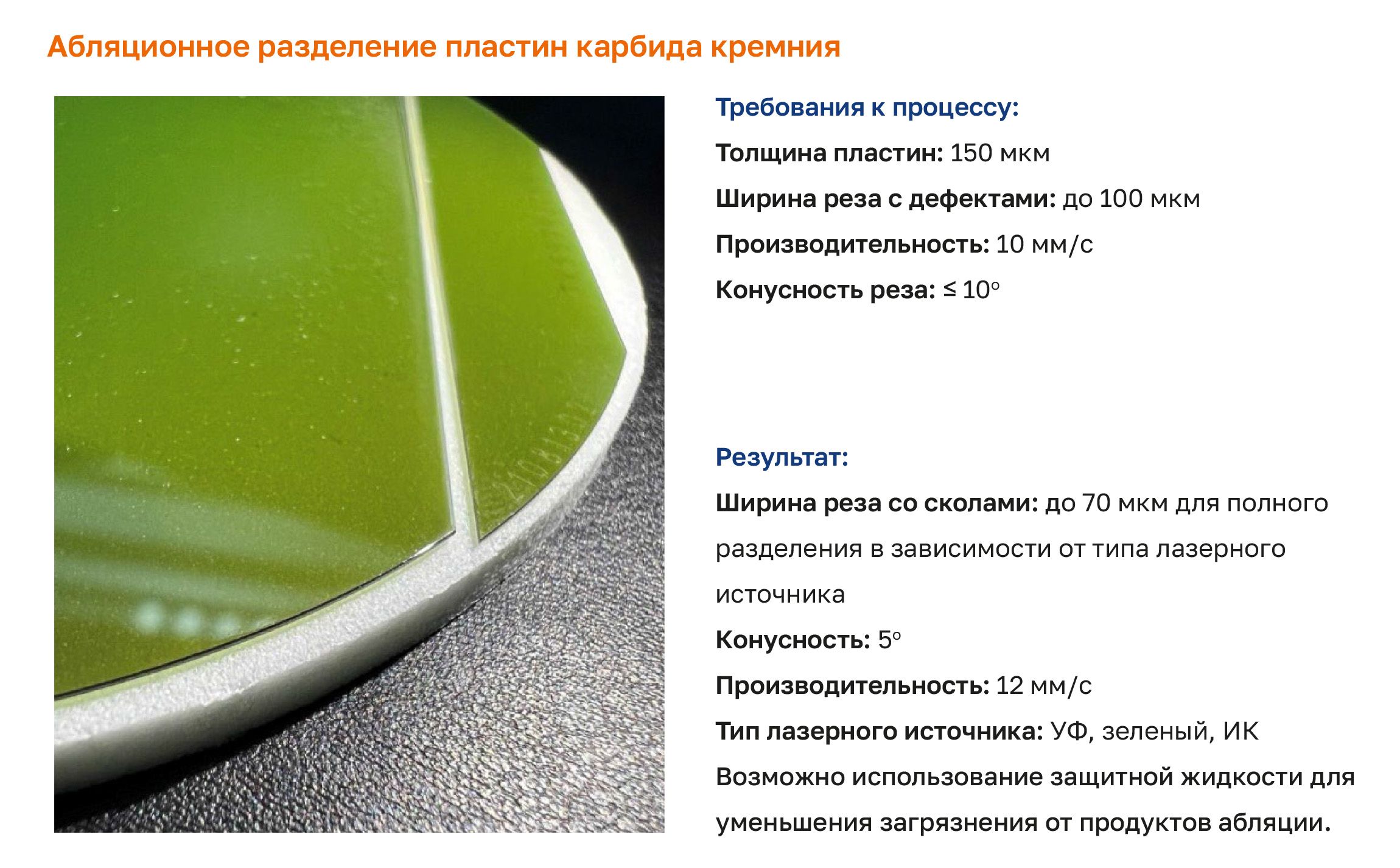 - Использование защитной технологической жидкости дополнительно минимизирует образование продуктов абляции и обеспечивает аккуратную линию разделения при работе с сапфиром, керамикой и тонкими подложками.
