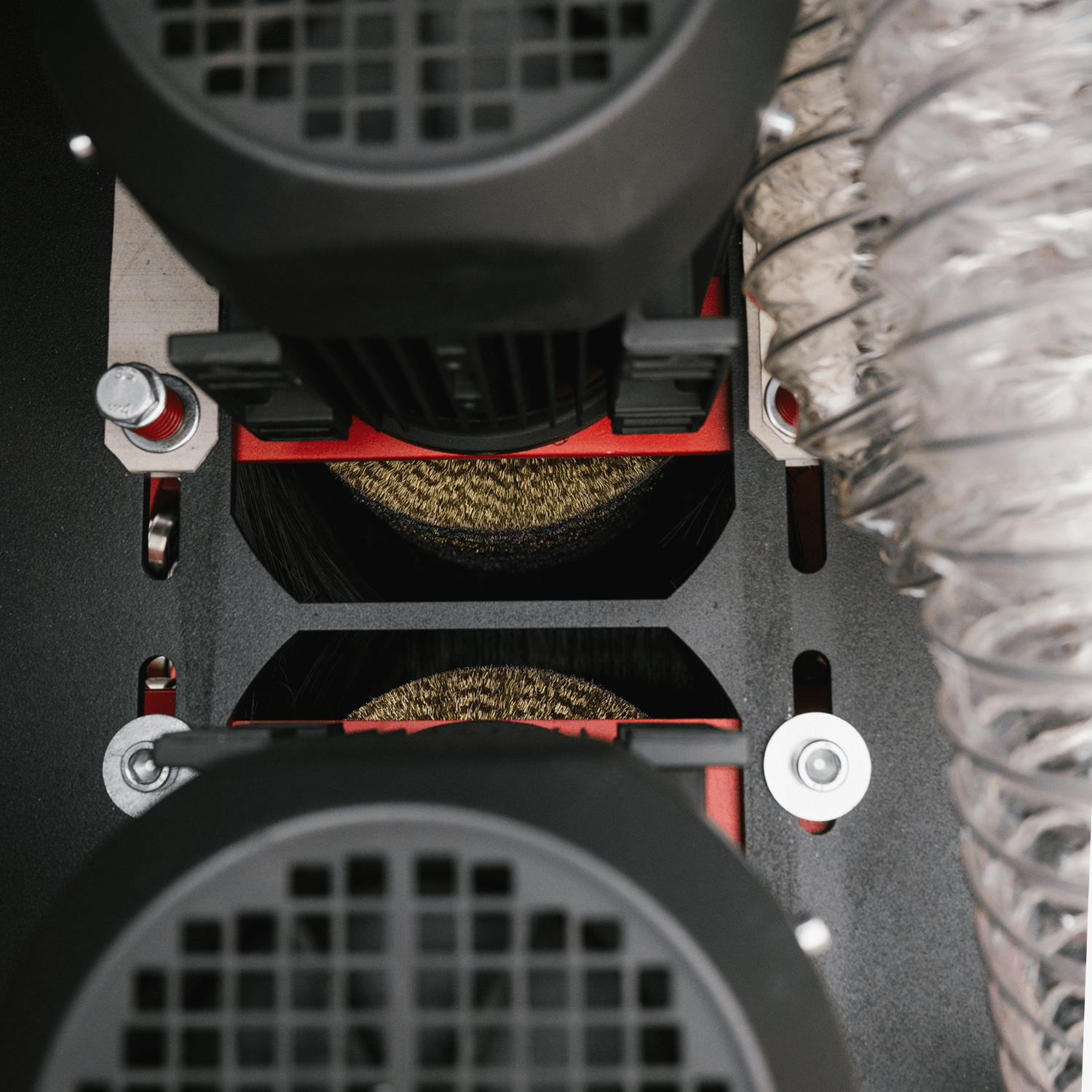 - Станок очищает трубу сразу с четырёх сторон с помощью металлических кордщёток. В отличие от моделей с односторонней обработкой, процедура выполняется за один проход, и нет необходимости перекладывать заготовку. Это значительно ускоряет процесс и уменьшает трудозатраты, а производительность становится выше в 5 раз по сравнению с ручной обработкой.